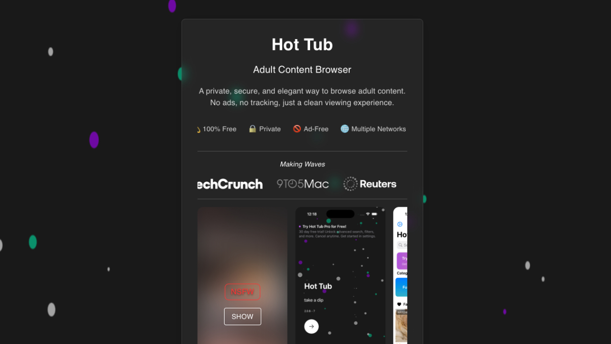 „Hot Tub“ zeigt auf Pornhub gehostete Videos an, wirbt für sich als „Erwachsenen-Content-Browser und werbefreie Alternative zu herkömmlichen Porno-Websites“. Die Anwendung kommt ohne Jugendschutzfunktionen aus, es gibt auch keine Altersbeschränkung. Die Entwickler haben sich zuvor in der Jailbreak-Community einen Namen gemacht.