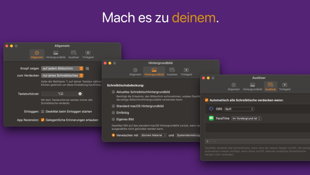 Besonders praktisch ist die Auto-Trigger-Funktion, die den Schreibtisch automatisch ausblendet, sobald bestimmte Anwendungen geöffnet werden. So kann DeskMat beispielsweise den Schreibtisch verbergen, wenn Programme wie OBS zum Streamen oder Pages für konzentriertes Arbeiten genutzt werden. Sobald die jeweilige Anwendung geschlossen wird, werden die Symbole wieder sichtbar.
