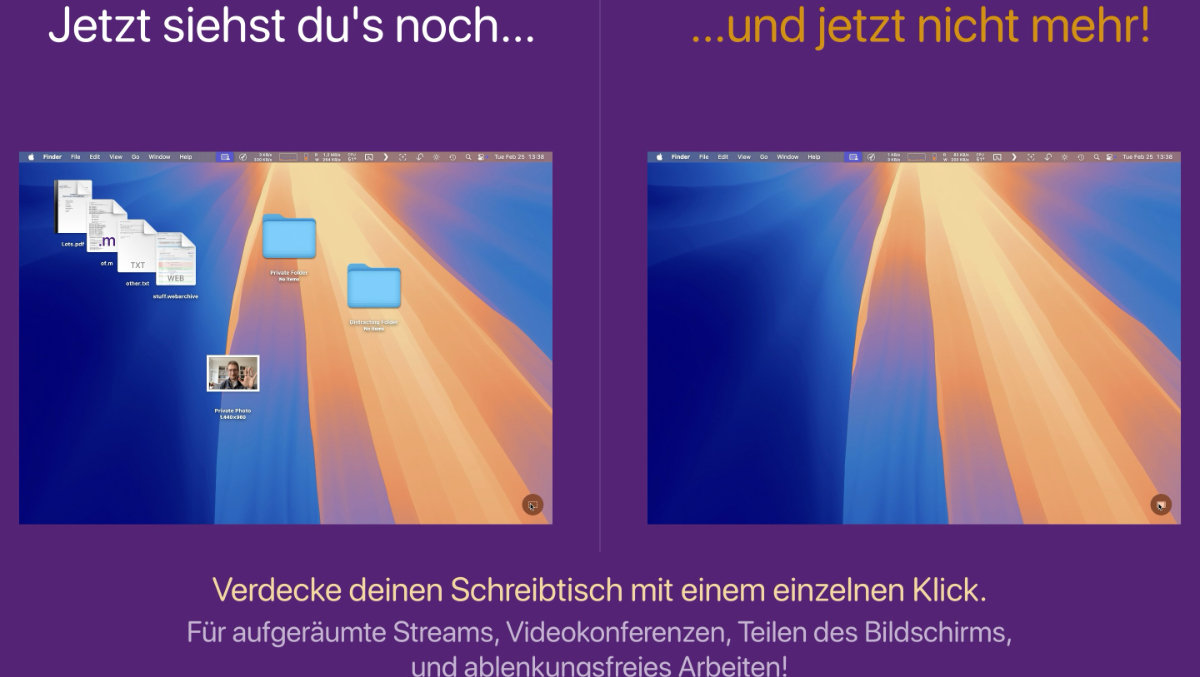 Die Applikation, ein echter Geheimtipp, blendet dazu sämtliche Dateien und Ordner auf dem Desktop aus. Besonders hilfreich ist die App für alle unter euch, die regelmäßig Bildschirmfreigaben nutzen, Präsentationen halten oder Inhalte streamen und dabei einen ordentlichen Bildschirm ohne störende Icons zeigen möchten.