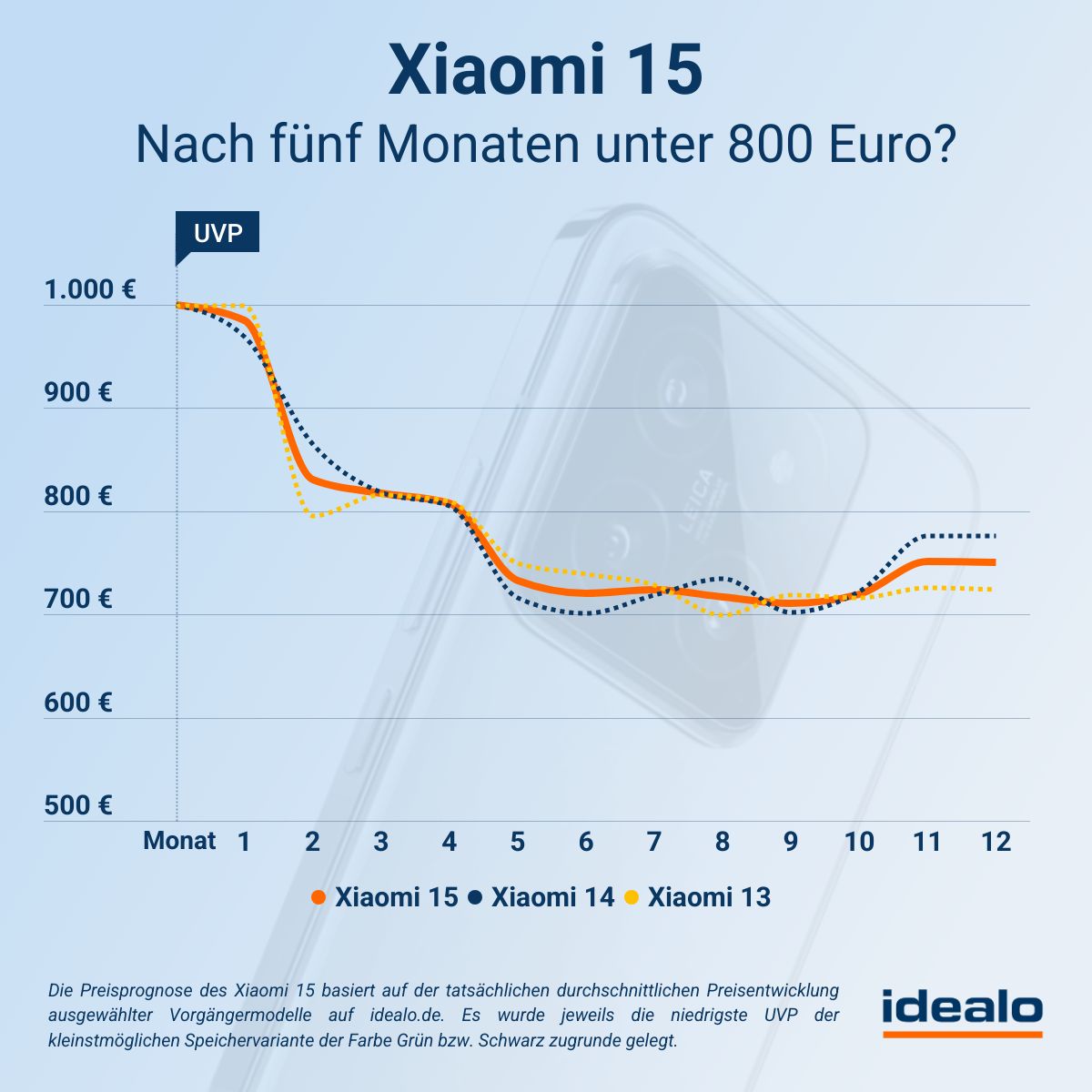 Die größte Ersparnis ist nach etwa fünf Monaten zu erwarten, wenn der Preis um bis zu 27 Prozent fällt und das Xiaomi 15 für weniger als 800 Euro angeboten wird. Anschließend dürfte sich die Preiskurve stabilisieren, sodass längeres Warten nicht mehr viel Ersparnis bringt.
