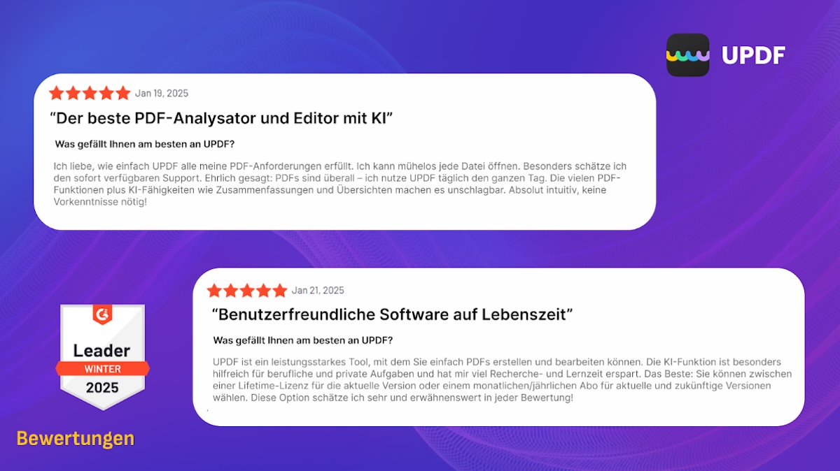 - „UPDF kann alles, was ich mir von einem PDF-Editor gewünscht habe. Es kann viel mehr, als ich jemals wollte, und das seit etwa 25 Jahren. In der Vergangenheit musste ich für die einfachsten Bearbeitungen einer PDF-Datei mehr für eine Jahreslizenz ausgeben, als ich für eine Lifetime-Lizenz benötigte, um jeden anderen Dateityp zu bearbeiten, der mir begegnen könnte. Einfache Dinge wie das Löschen von Teilen, die ich nicht benötigte, oder das Einfügen zusätzlicher Elemente, die ich brauchte, oder das Zusammenfassen mehrerer Dokumente zu einer einzigen Quelle. Ich habe nicht verstanden, warum so viele Dokumente dieses Format verwendeten, außer weil sie nicht wollten, dass die Benutzer ihre Dokumente ändern. Was auch immer der Grund sein mag, UPDF hat die Rechte zur PDF-Bearbeitung demokratisiert. Okay, es ist nicht kostenlos, aber der Preis ist so niedrig, dass er dem entspricht, was ich für ein paar Monate eines Video-Streaming-Dienstes oder eine monatliche Zahlung für einen Mobilfunkdienst zahle. Und das für einen lebenslangen Zugang. Vielen Dank.“