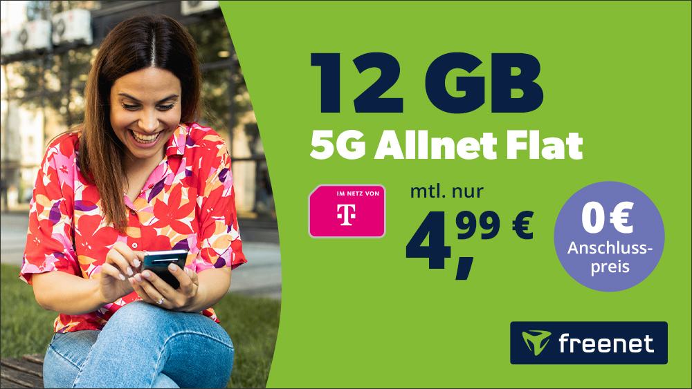 Der Deal, der hier bereitsteht, ist eine Internet-Flat mit 12 GB Datenvolumen plus 50 GB Datendepot. Ihr zahlt nur 4,99 Euro pro Monat. Das 5G-Netz kann mit max. 50 Mbit/s genutzt werden. Viele von euch kommen mit dieser Geschwindigkeit wohl locker hin. Gefunkt wird im Netz der Telekom.