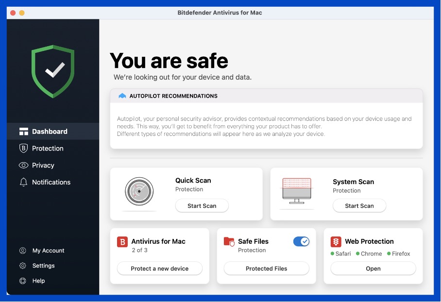 Bitdefender ist bekannt für seine gute Malware-Erkennung und geringe Auswirkungen auf die Systemleistung. Die Mac-Version von Bitdefender Antivirus bietet zuverlässigen Echtzeitschutz und enthält eine Time Machine-Funktion, die eure Backups vor Ransomware-Angriffen schützt.