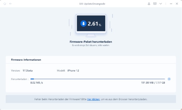 4. ReiBoot erkennt Ihr Gerätemodell und fordert Sie auf, das entsprechende iOS 26 Firmware-Paket herunterzuladen. Klicken Sie auf „Herunterladen“ und warten Sie, bis der Download des Firmware-Pakets vollständig abgeschlossen ist. Dies kann je nach Internetgeschwindigkeit einige Zeit dauern.