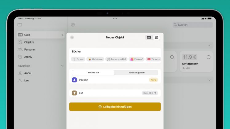 Mit der neuen Version lassen sich jetzt zusätzlich Objekte statt nur Geld erfassen. Leihvorgänge können nach Personen organisiert werden, mit Favoriten für schnellen Zugriff – inklusive Sidebar-Ansicht auf dem iPad. Die Währungswahl ist anpassbar, zudem gibt es Widgets für Home- und Sperrbildschirm sowie das Kontrollzentrum.