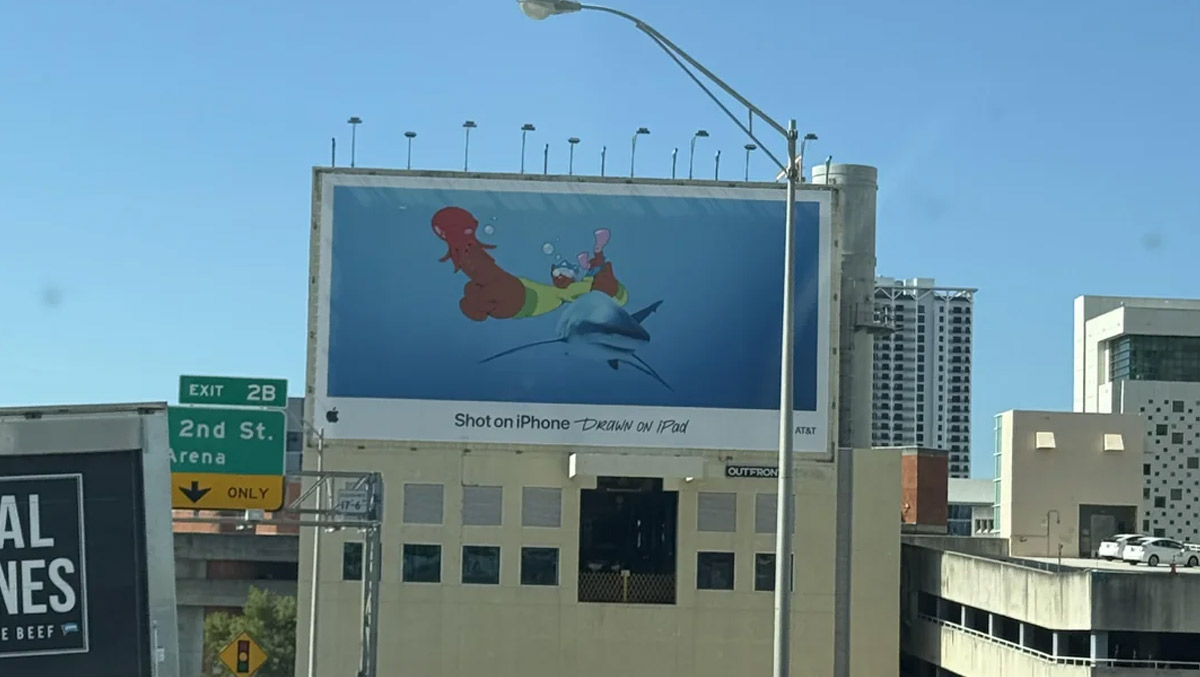 An der I‑95 in Miami wurden Billboards aufgestellt, die Fotos von iPhone-Nutzern zeigen, die anschließend von iPad-Künstlern nachbearbeitet wurden. Aus der Entfernung sieht ein Motiv der Galerie wie ein gigantischer Finger oder ein Phallus aus: Ein Surfer, der am Hai hängt, mit einem überdimensionalen Finger, der von einem Kraken saugt – offenbar weckt das bei Autofahrern Assoziationen, die Apple nicht beabsichtigt hatte.