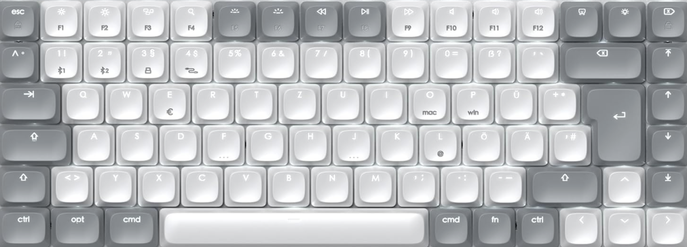 Für mehr Sicherheit unter macOS sorgt eine Tastensperre, und ein LED-Hinweis auf der Leertaste warnt euch bei niedrigem Akkustand. Im kabellosen Betrieb spart die Tastatur Energie: Nach einer Minute Inaktivität schaltet sich die Beleuchtung aus, nach 30 Minuten geht das Gerät in den Schlafmodus.