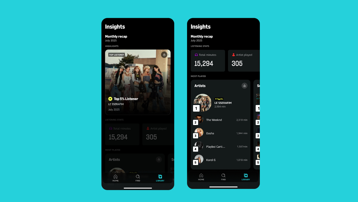 Ihr findet es in der Bibliothek – oben rechts erscheint ein Symbol, das neue monatliche Rückblicke freischaltet. „Insights“ bietet eine Übersicht über eure zuletzt gestreamten Songs, Podcasts und Künstler, rechnet insgesamt gehörte Minuten sowie die Anzahl der abgespielten Titel hoch und zeigt eure Top‑5 in jeder Kategorie – vom meistgehörten Act bis zur beliebtesten Podcastfolge.