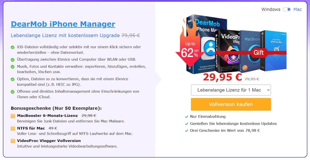DearMob iPhone Manager bietet ein Flash-Angebot, das ein Upgrade zu einer einfachen und intelligenten Investition macht. Für unbegrenzten Zugriff erhalten Sie die lebenslange Lizenz mit 62 % Rabatt. Das erhalten Sie mit einem Kauf: