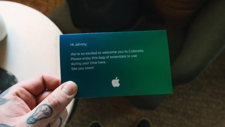 Die Einladung begrüßt ihn mit den Worten: „We’re so excited to welcome you to Colorado. Please enjoy this bag of essentials to use during your time here. See you soon!“ Dem Schreiben beigelegt war ein Rucksack im Outdoor-Stil mit Apple-Logo, offenbar inklusive einer weißen Wasserflasche aus Apples Merchandise-Sortiment.