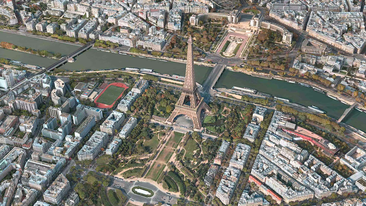 Mit spektakulären 3D-Ansichten lud sie zu vorgefertigten Luft-Touren durch Städte wie Paris, New York oder Berlin ein – inklusive Kameraflug über Wahrzeichen und Parks.