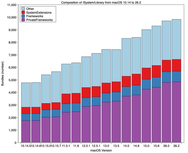 Das US-Portal eclecticlight hat sich die Dateien und Komponenten im System-Library-Ordner verschiedener macOS Versionen der letzten 6 Jahre angeschaut und festgestellt, dass sich deren Zahl drastisch erhöht hat. Waren es 2019 in macOS Mojave noch 4.800 Bundles, gibt es heute in macOS 26.2 schon 9.800.