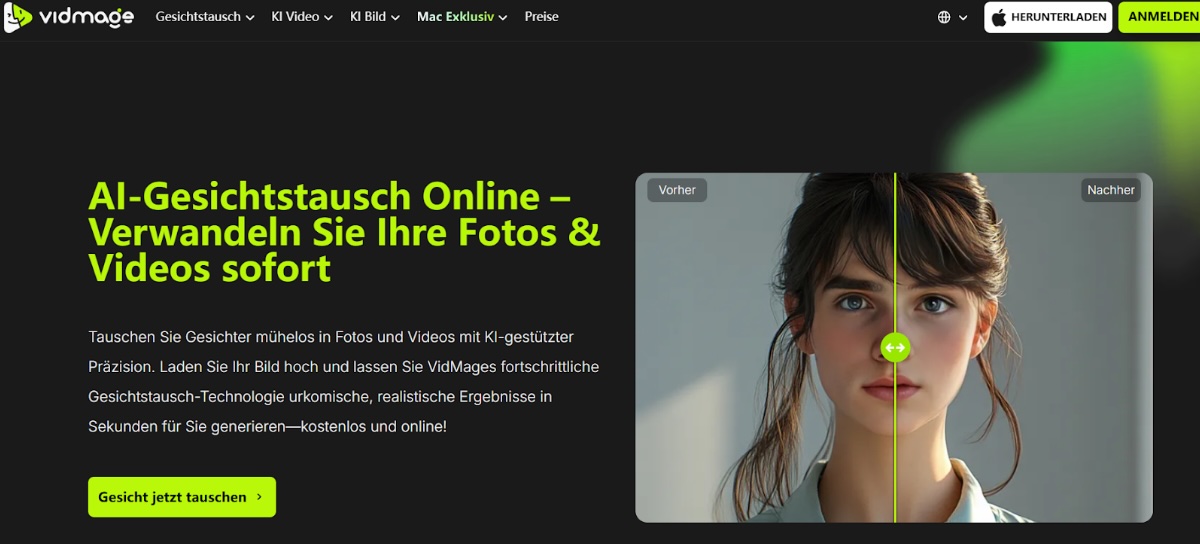 Nachdem wir die wichtigsten Kriterien für ein professionelles Gesichtertausch-Tool kennen, stellt sich die Frage: Gibt es eine Lösung, die diese Anforderungen zu einem ausgewogenen Gesamtpaket vereint? An dieser Stelle kommt Vidmage ins Spiel – eine Plattform, die sich nicht als reines Spielzeug, sondern als vielseitiges KI-Kreativsuite positioniert und insbesondere mit ihrer „Video Face Swap“-Funktion punktet.