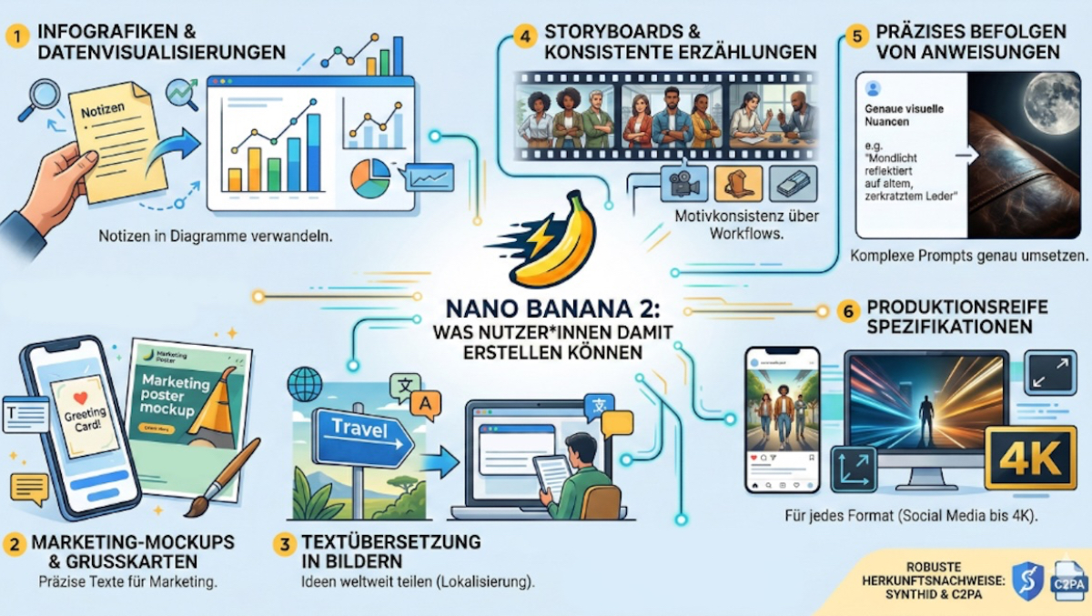 Außerdem kann das Modell Texte korrekt darstellen, übersetzen und lokalisiert einbinden, was besonders für Marketing-Assets, Poster oder international nutzbare Grafiken hilfreich ist.