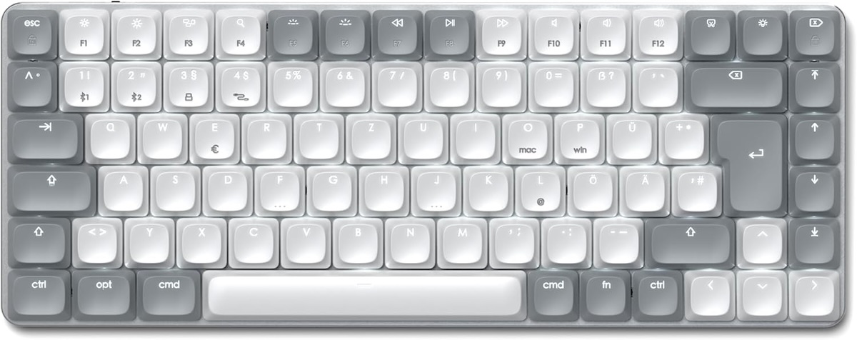 Die Tastatur nutzt ein deutsches QWERTZ-Layout, setzt auf leise Scissor-Switch-Tasten und wird über USB-C aufgeladen.