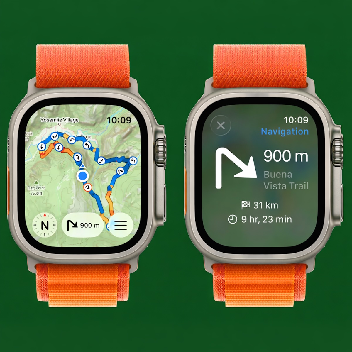 Die App bietet echte Offline-Karten, Routenplanung am iPhone und Abbiege-Navigation direkt am Handgelenk – komplett ohne iPhone oder Netz. Das jüngste Update ermöglicht erstmals das Erstellen von Wegbeschreibungen für jede Route.