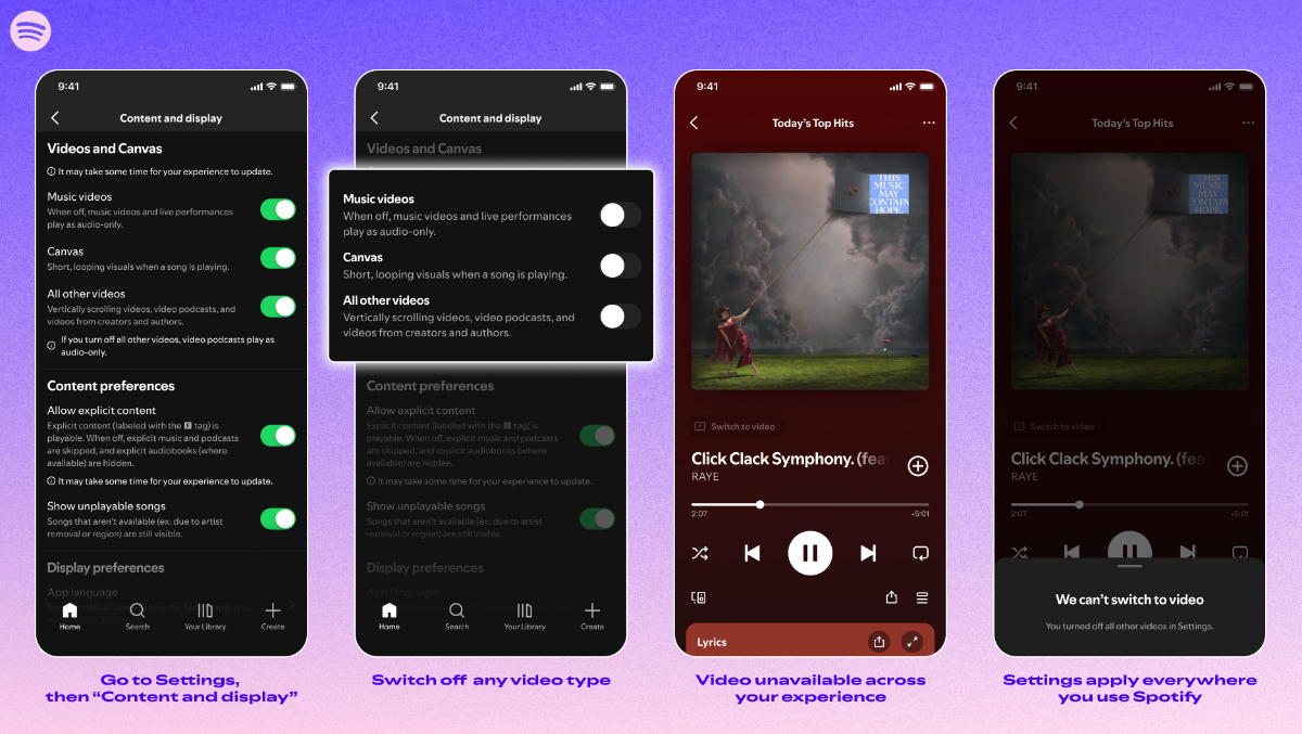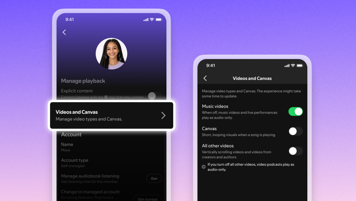 Dazu zählen die kurzen Canvas-Clips, Musikvideos sowie weitere Videoformate etwa in Podcasts. Die gewählten Optionen gelten plattformübergreifend – also auf Smartphone, Desktop, Web und TV.
